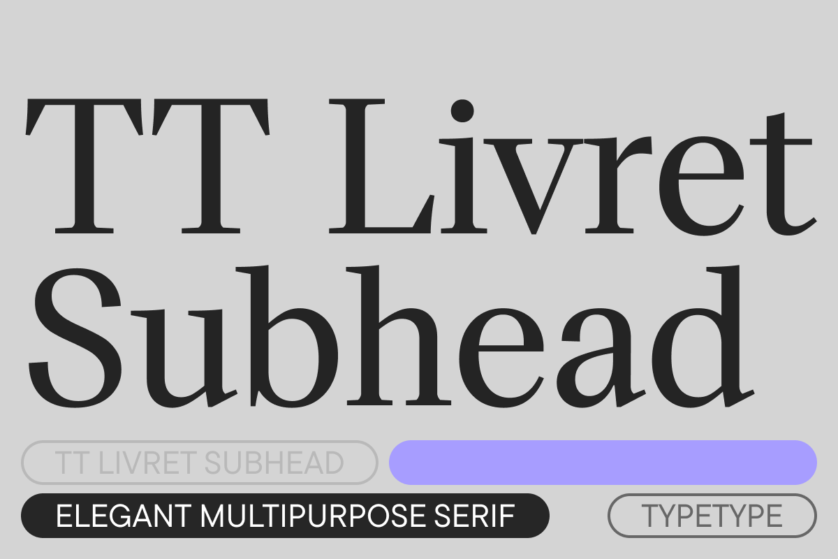 TT Livret is an elegant, modern, and functional serif featuring both text and expressive display subfamilies. The font looks harmonious in books and other periodicals, on posters, and on magazine covers. The use range of TT Livret goes far beyond the printing industry, as this font gives an aesthetic look to any text typed in it. The Subhead subfamily in the font combines the calmness of the text subfamily and the more expressive contrast of the display one.