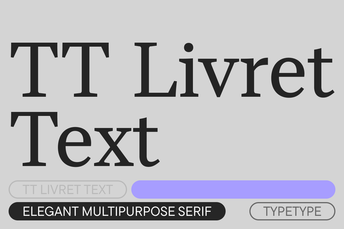 TT Livret is an elegant, modern, and functional serif featuring both text and expressive display subfamilies. The font looks harmonious in books and other periodicals, on posters, and on magazine covers. The use range of TT Livret goes far beyond the printing industry, as this font gives an aesthetic look to any text typed in it. The Text subfamily of TT Livret has static proportions, a tranquil personality, oval shapes of rounded characters, loose spacing, and open apertures.