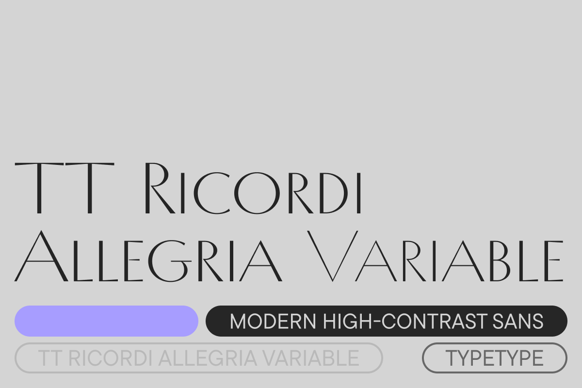 TT Ricordi Allegria is a modern high-contrast sans. TT Ricordi Allegria stands out for its hyperbolically dynamic proportions, pronounced contrast, wedge-shaped stroke ends, and the absence of traditional serifs. The source of inspiration for TT Ricordi Allegria was the inscription remains found within the Basilica di Santa Croce, Florence. The typeface stands out for its hyperbolically dynamic proportions, pronounced contrast, wedge-shaped stroke ends, and the absence of traditional serifs.
