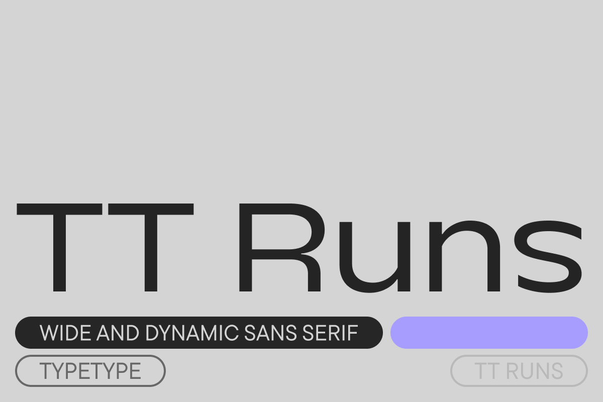 TT Runs is a wide sans serif with unusual proportions. This font was designed for the sports industry. Before diving into the development, we thoroughly researched the identities of various Olympic venues and analyzed current sports brands. We made every effort to design a unique, stylish, modern font well-suited for the sports sector—and more!