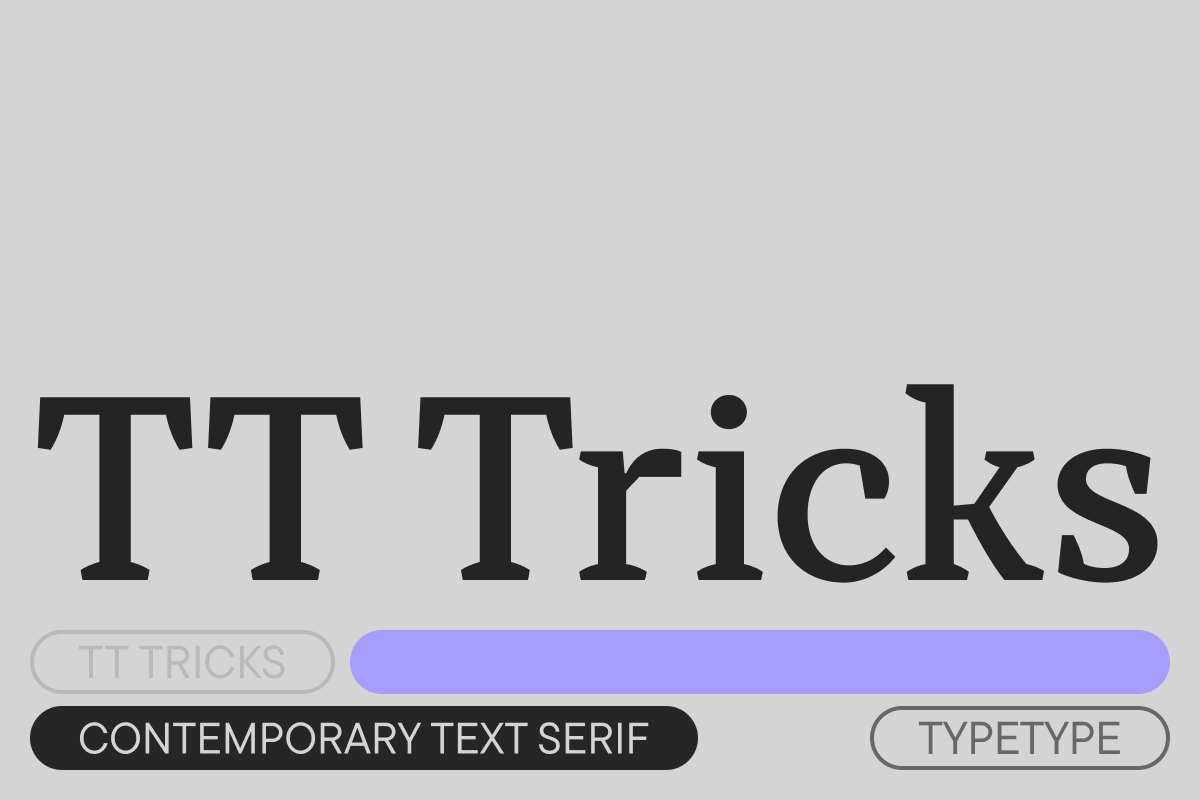 TT Tricks is a modern text serif with a design reflecting the style of Transitional serifs. This font has a calm, elegant, and moderately stern character. It stands out for its relatively low stroke contrast, large serifs, narrowed proportions, and slightly squared forms of round characters. All these visual aspects give the font a distinctly formal tone. TT Tricks is a genuine classic: it looks modest but highly relevant. Due to this appearance, the font has an extensive application range.