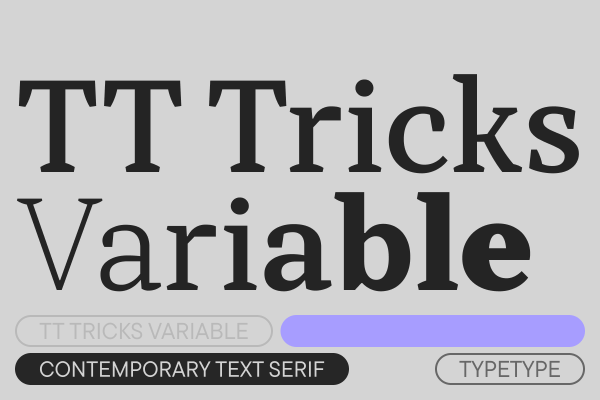 TT Tricks is a modern text serif with a design reflecting the style of Transitional serifs. This font has a calm, elegant, and moderately stern character. It stands out for its relatively low stroke contrast, large serifs, narrowed proportions, and slightly squared forms of round characters. All these visual aspects give the font a distinctly formal tone. TT Tricks is a genuine classic: it looks modest but highly relevant. Due to this appearance, the font has an extensive application range.