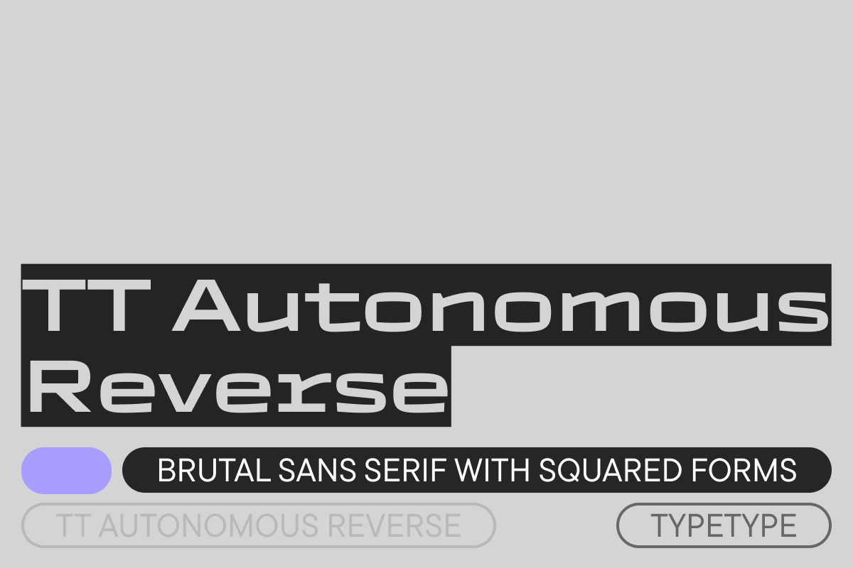 TT Autonomous is a modern brutal technological sans serif. The basic visual characteristic of the typeface is the noticeable squareness of the characters and angular internal space. In addition, the typeface proportions tend to appear monospaced, but they are not really monospaced. The width of the characters is inspired by automobile logotype proportions, which are mostly rather wide.