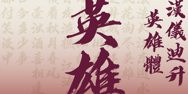 潇洒字如,英雄本色,汉仪迪升英雄体,是汉仪字库签约作者迪升于2018年创作的第一款手写体。飞扬而有力的字形,豪放而不羁的笔触,洋洋洒洒,有气吞山河之势。结构舒展,笔意连贯,书写的速度感形成笔画飞白增添了细节。这款字体作为标题字体富有视觉冲击力,适合影视娱乐等各类应用场景,彰显英雄气概。