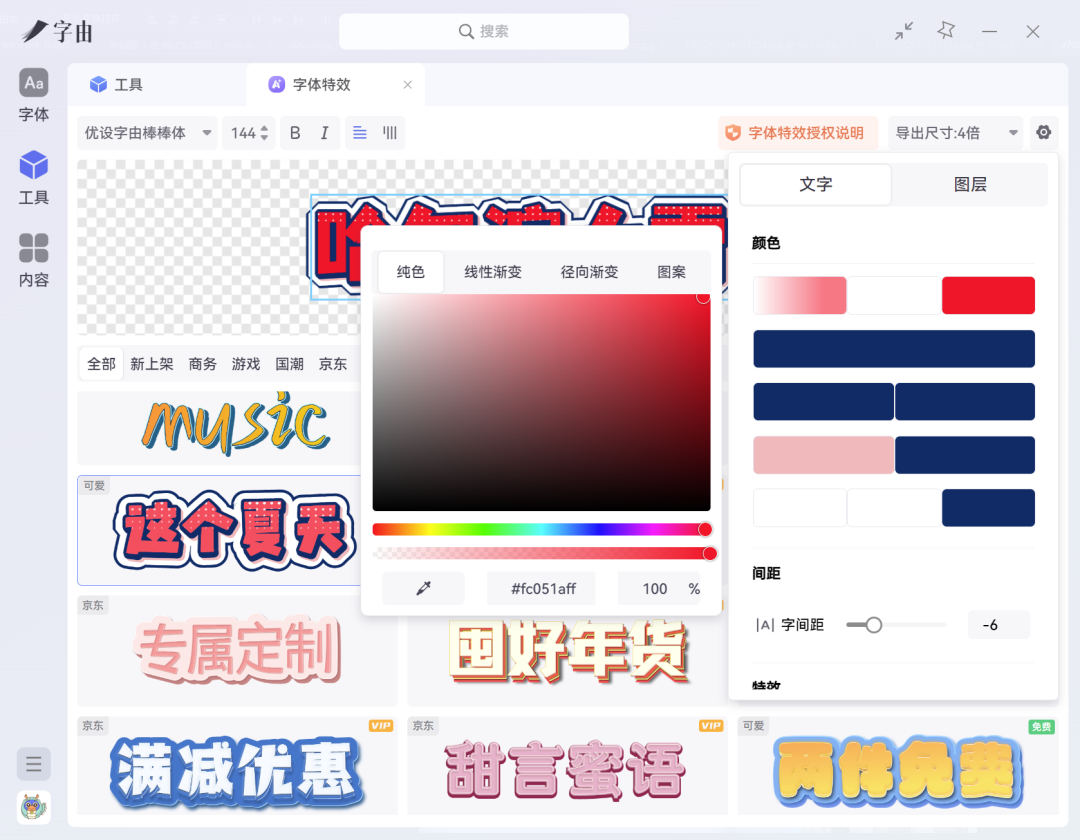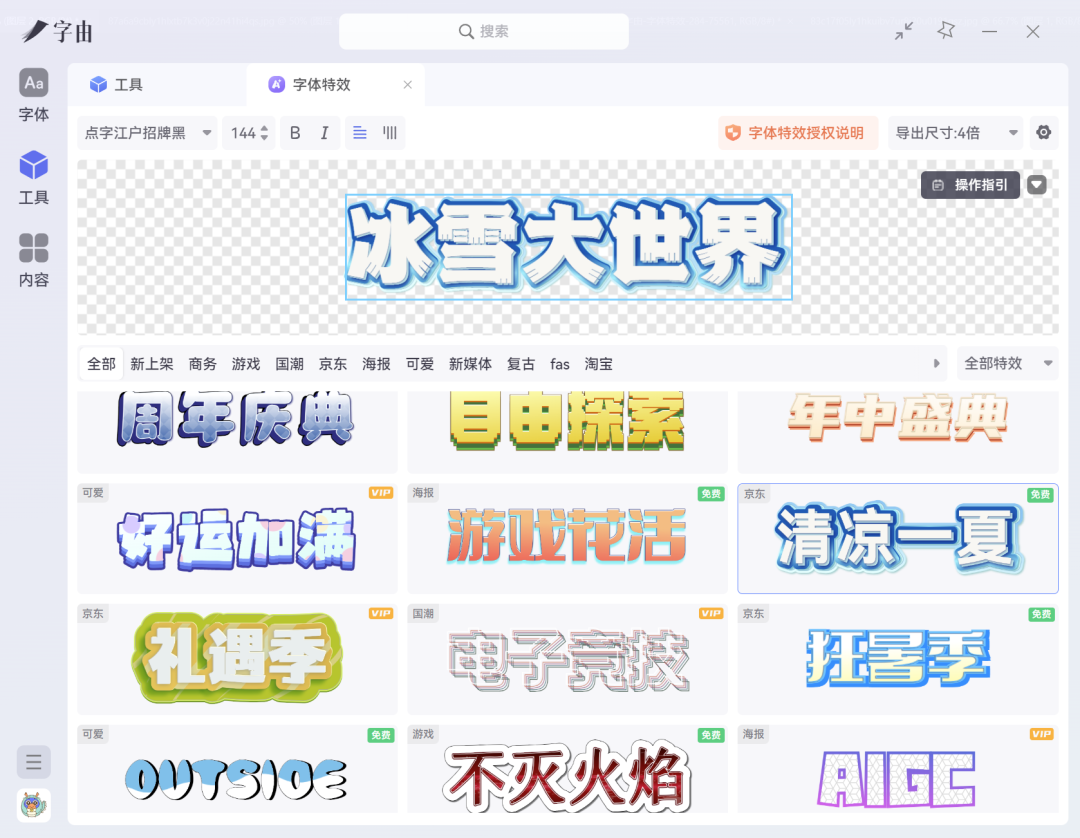 第一个当然是顶流大雪人,用的还是优设字由棒棒体(官方表情包字体),再选一个自带雪花的特效,调整下颜色。