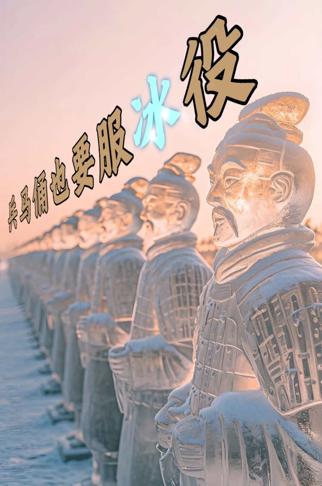 除了玩,冰雕艺术也绝对让你大开眼界,比如“冰”马俑,用两种特效搭配在一起,就可以营造出古今穿梭的感觉,字体选的是点字榜刻体。