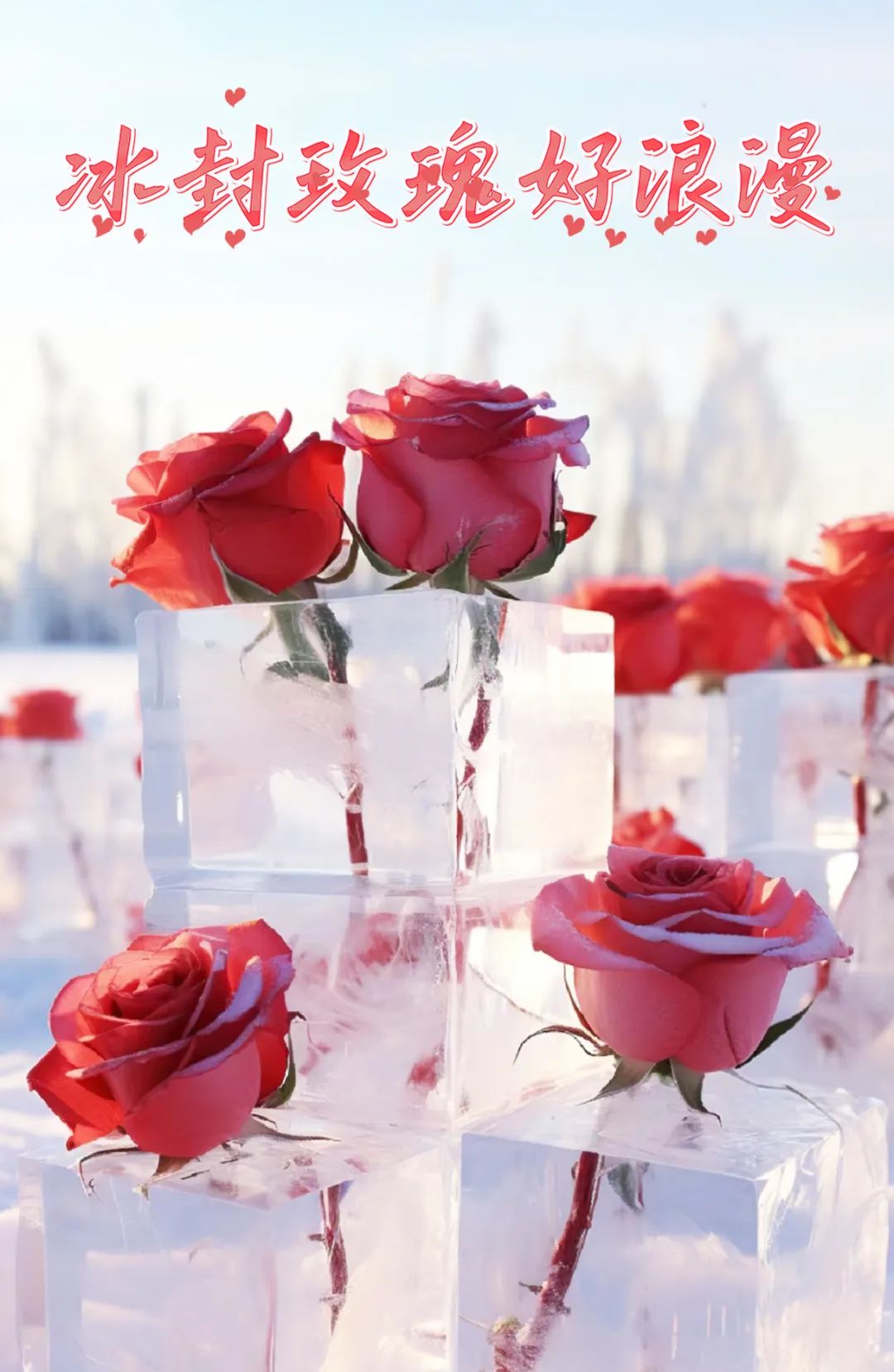 就算你不喜欢花,也会被冰封玫瑰狠狠拿捏,那种定格的美,真是太浪漫了,必须配上点字热烈体,再加一点小心心。