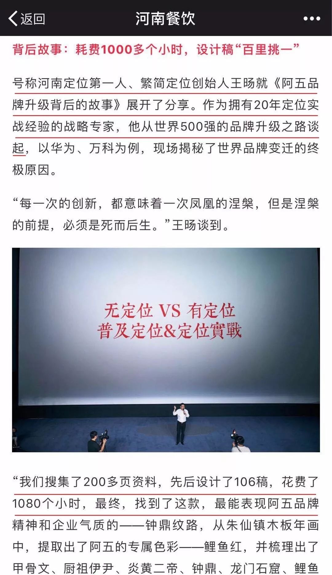 起因是号称河南定位第一人、繁简定位创始人王旸及号称河南视觉锤设计第一人、繁简定位联合创始人童画,搜集200页资料,花费1080个小时,先后设计了106稿,百里挑一的全新阿五品牌logo,竟然是直接电脑打出的“汉仪神工简体”字库字体。